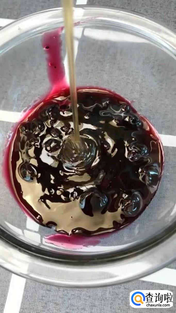 然后在一个碗中加入适量的蓝莓酱,蜂蜜和冰水,搅拌均匀,如下图所示。