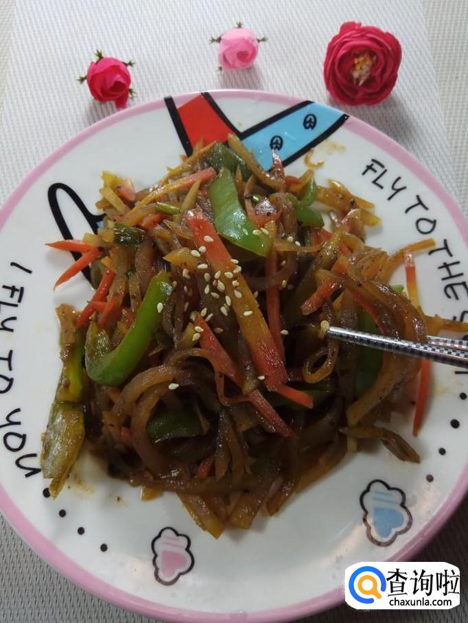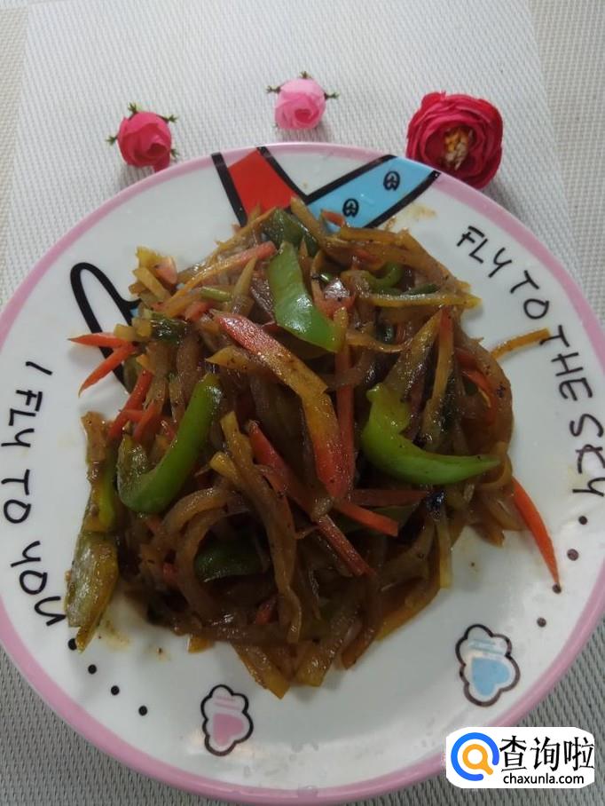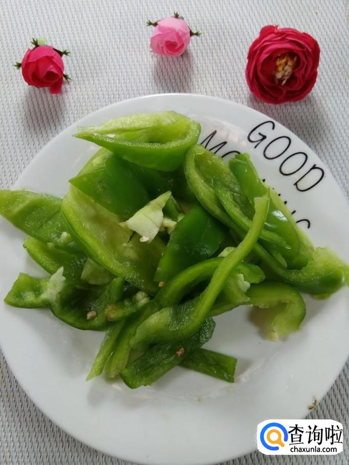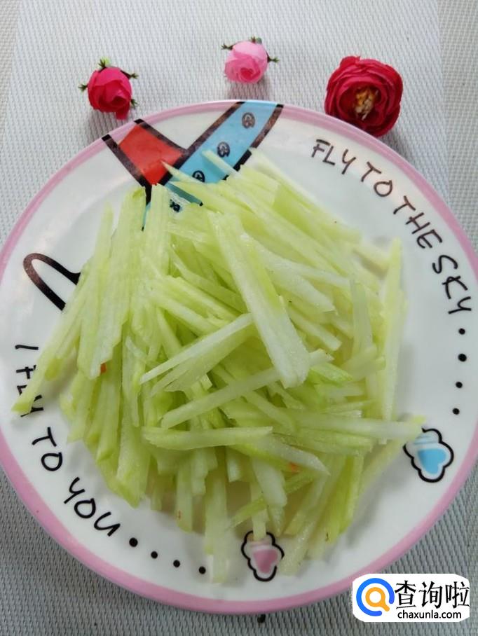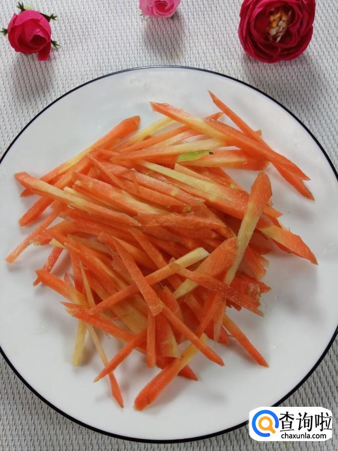 将白萝卜去皮,洗净后切成丝,放入盘中备用;将胡萝卜去皮后,切丝备用;将青椒也切成丝,放入盘中备用。