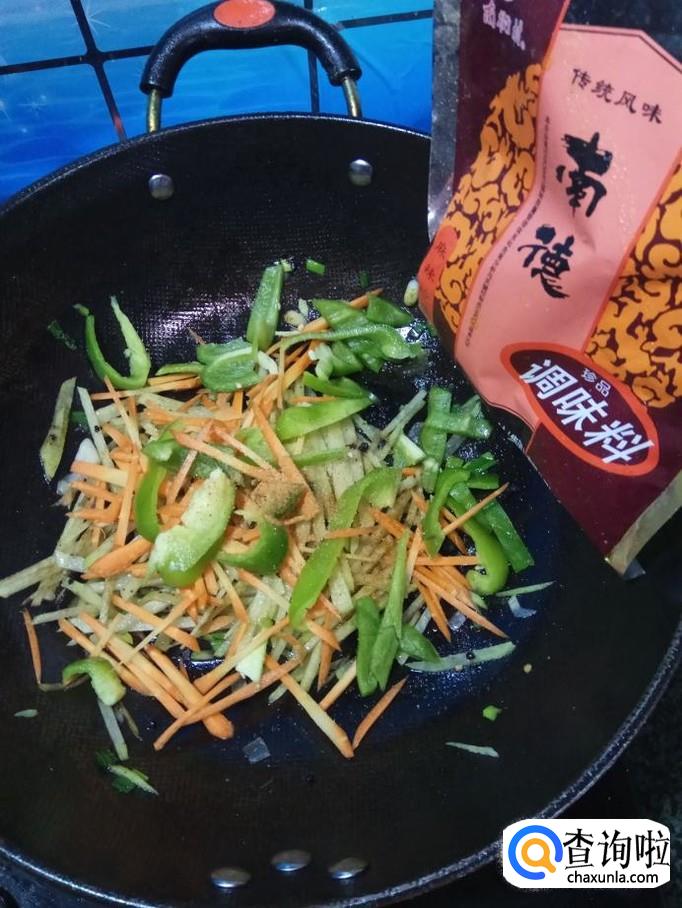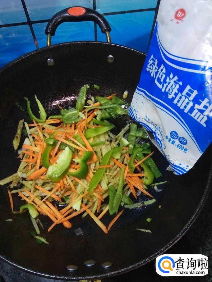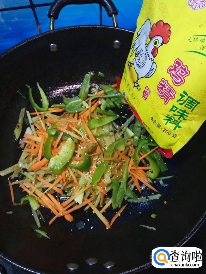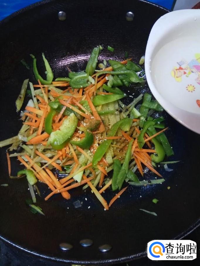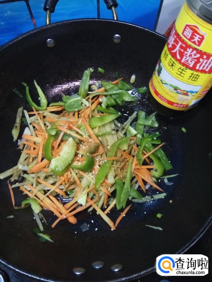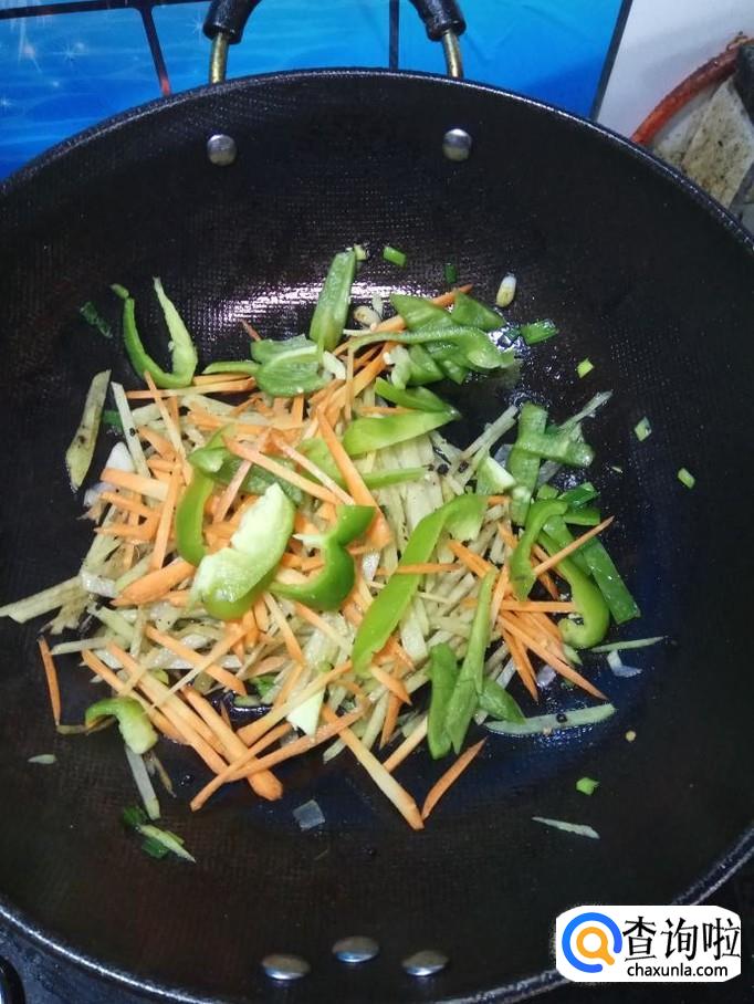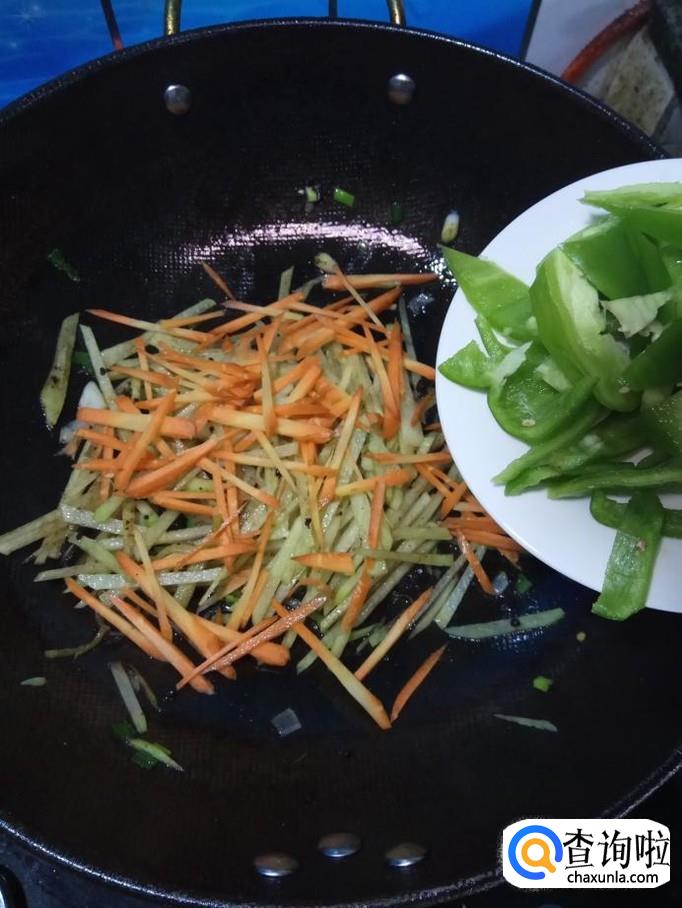 将青椒丝也倒入锅中,和胡萝卜丝,白萝卜丝一起翻炒均匀。