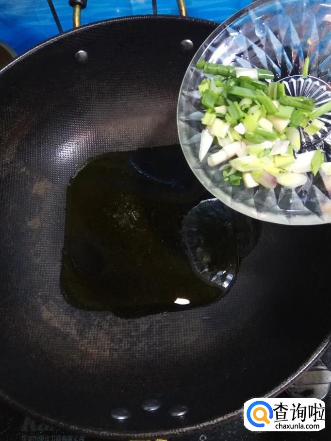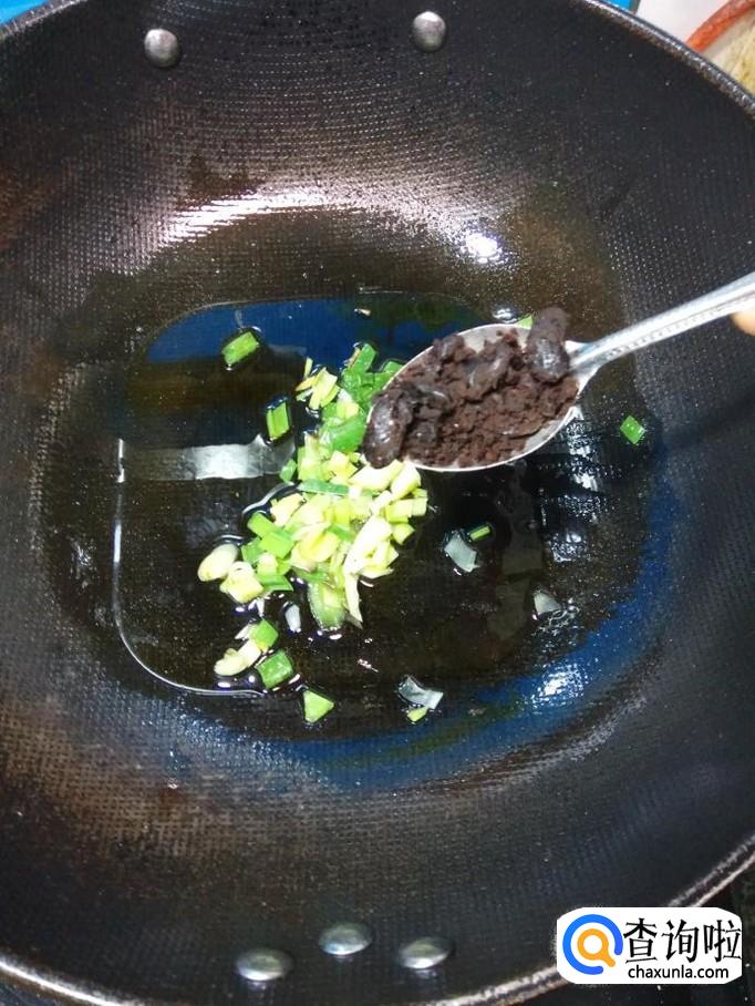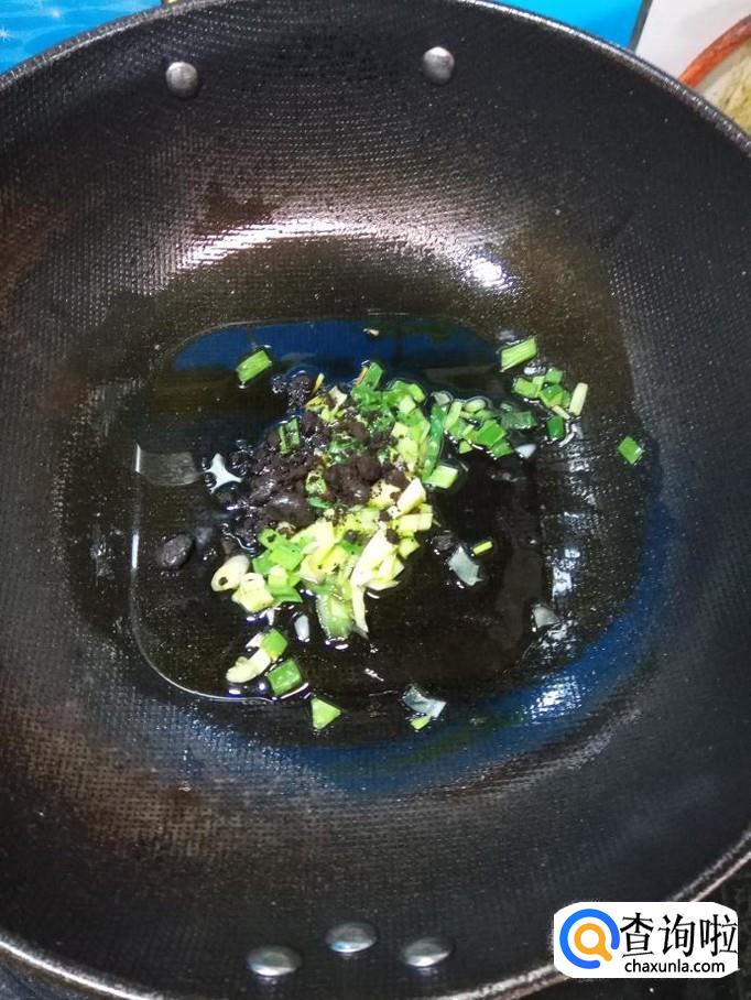 准备适量小葱,洗净后切碎,炒锅中放入适量油,油热后将小葱放入锅中炒香,然后将豆豉也放入锅中炒香。