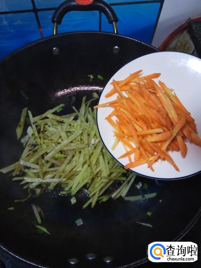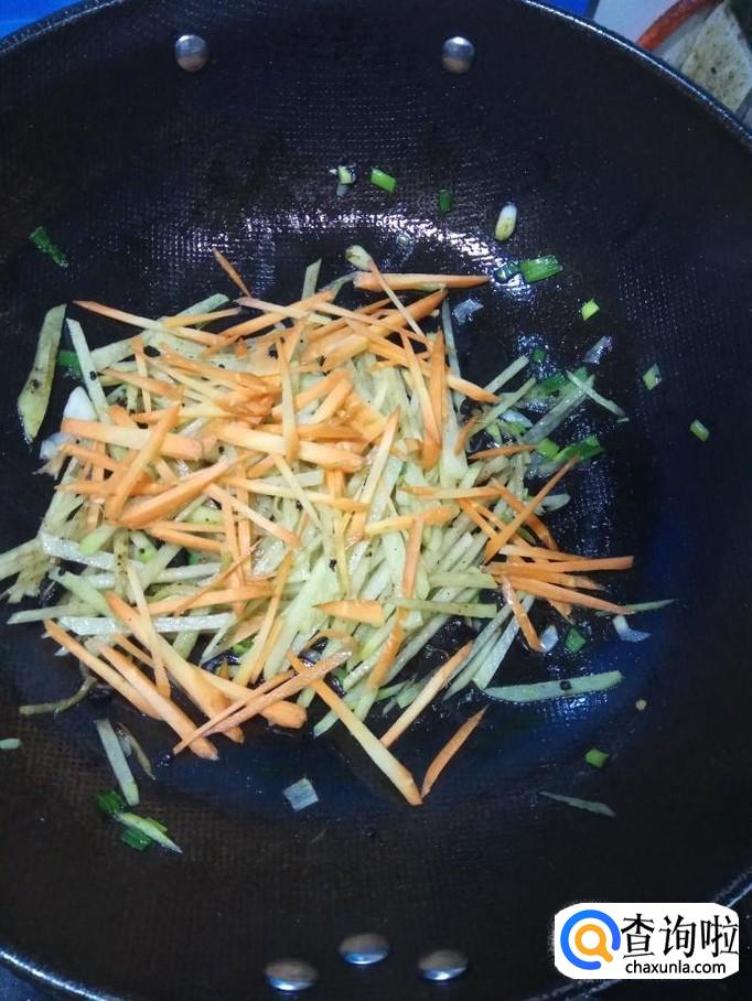 将准备好的胡萝卜丝和白萝卜丝倒入锅中,翻炒均匀。