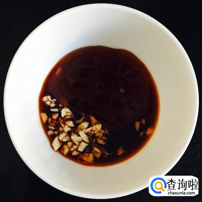 把切好的蒜末放入碗中,分别加入适量的蚝油,味极鲜酱油,少许清水搅拌均匀调成碗汁