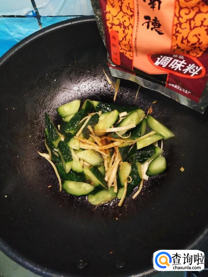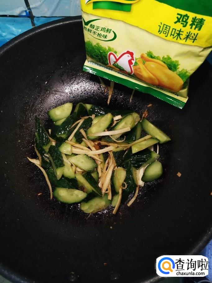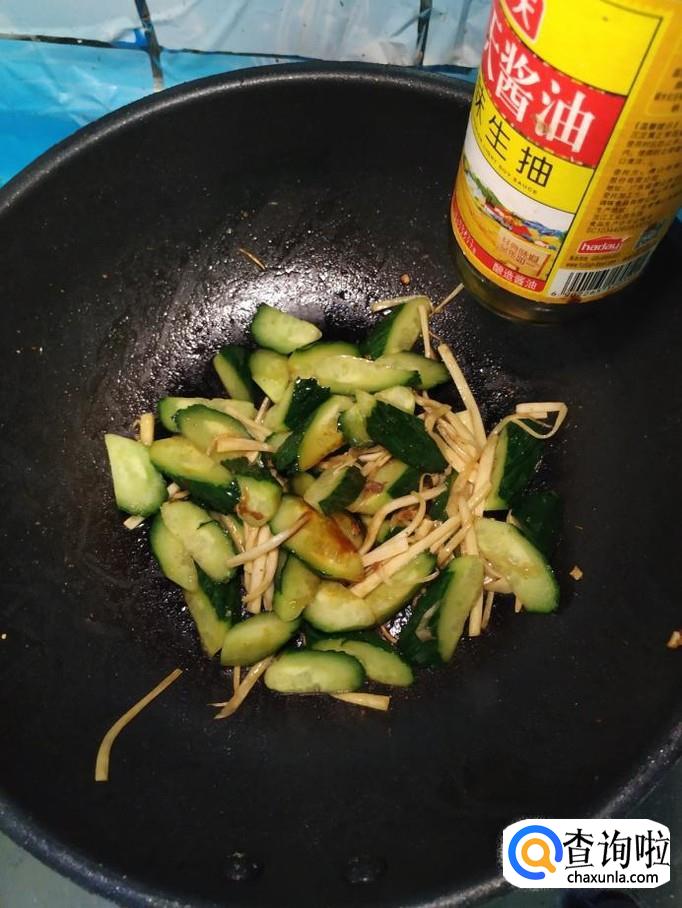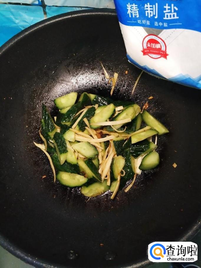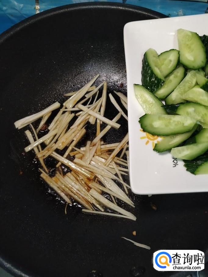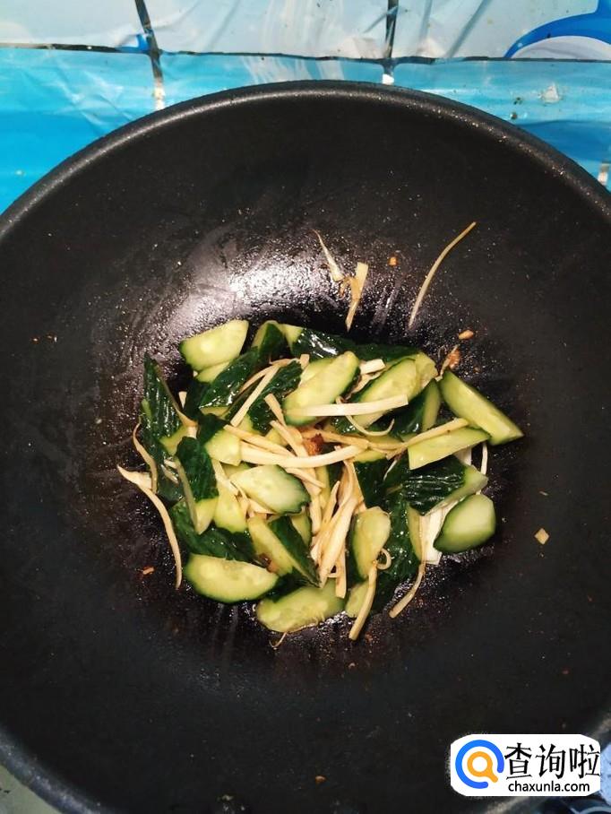 将黄瓜块放入锅中,和茭白丝一起翻炒均匀。
