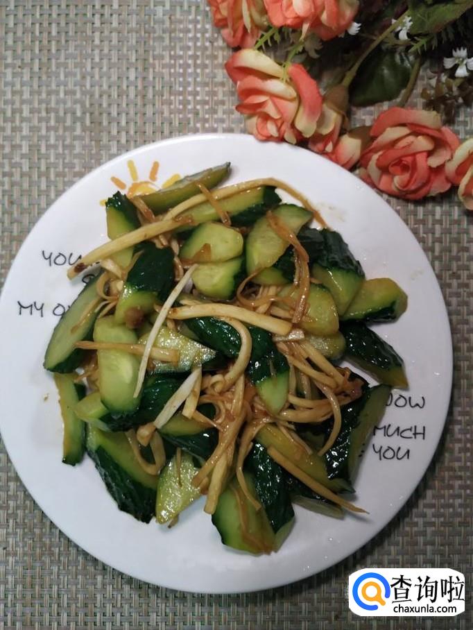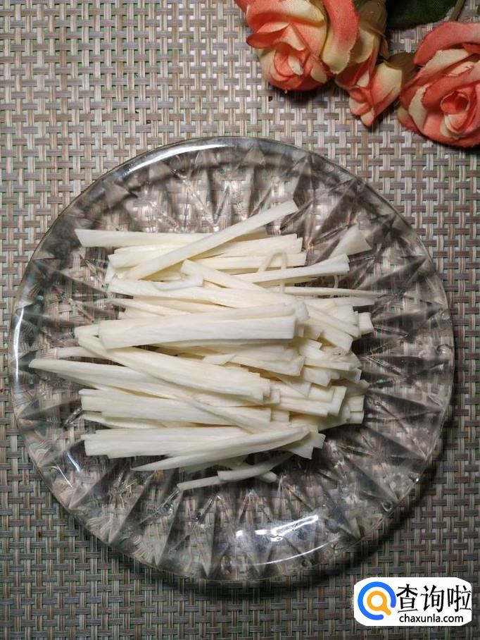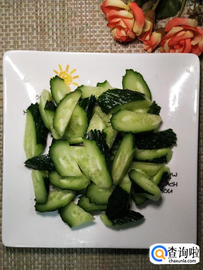 准备一根黄瓜,洗净后,切成滚刀块,放入盘中备用,再准备适量茭白,洗净后去外皮,切成丝,放入盘中备用。