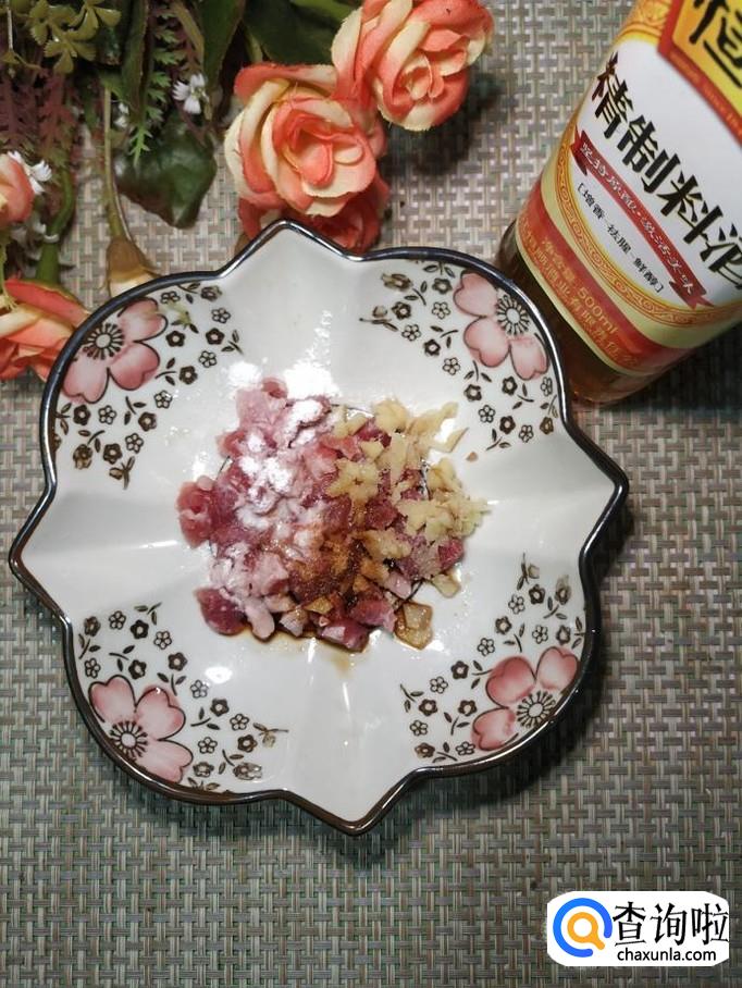 准备一块牛肉,洗净后,切成末,放入适量姜末,盐,鸡精,五香粉,生抽,料酒,淀粉,搅拌均匀,腌制十分钟左右。