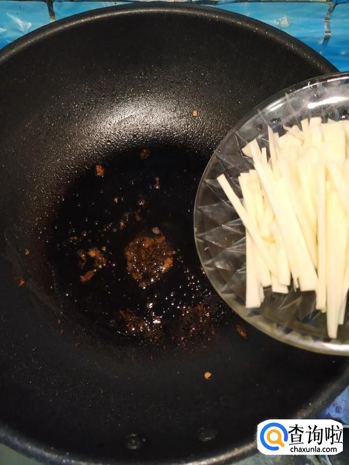 锅中留少许油,放入白砂糖,炒出糖色,将茭白丝,倒入锅中,翻炒均匀。