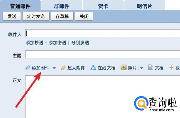 打开邮箱发送邮件页面,点击里面的‘添加附件’。