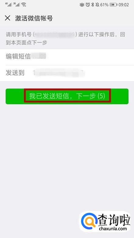 再用手机号验证,要注册这个号的手机号,用这个手机号发一条信息到它规定的账号,点击已发送,再点击下一步,这就要二台手机操作了。因为你正在这个页面,如果去发信息,那就会错过时间。这台手机停留在这个画面,那台手机发信息,然后再点击我已发送就好。