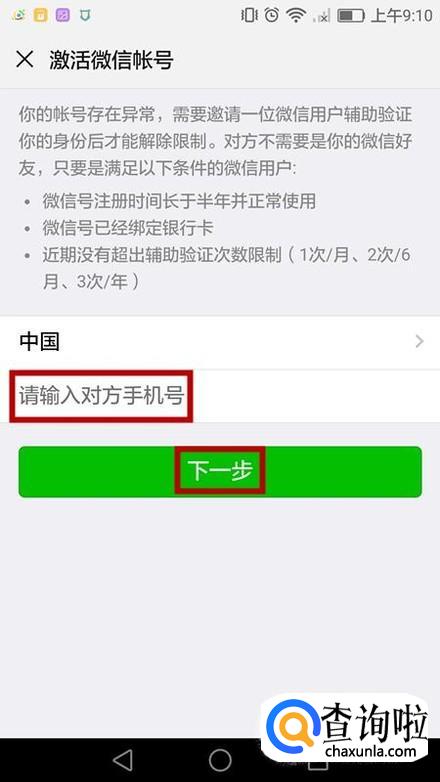 然后自己手机操作完后,现在去求助好友帮你辅助完成下一步的。先输入对方的手机号。如图所示。