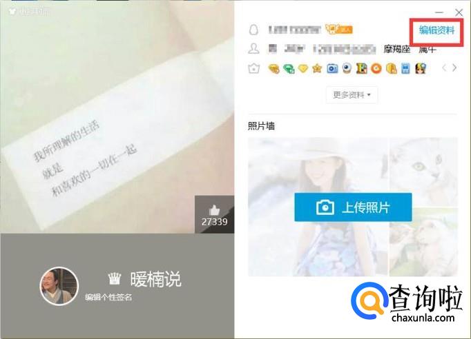 弹出的自己的资料卡,点击QQ号后面的编辑资料选项。