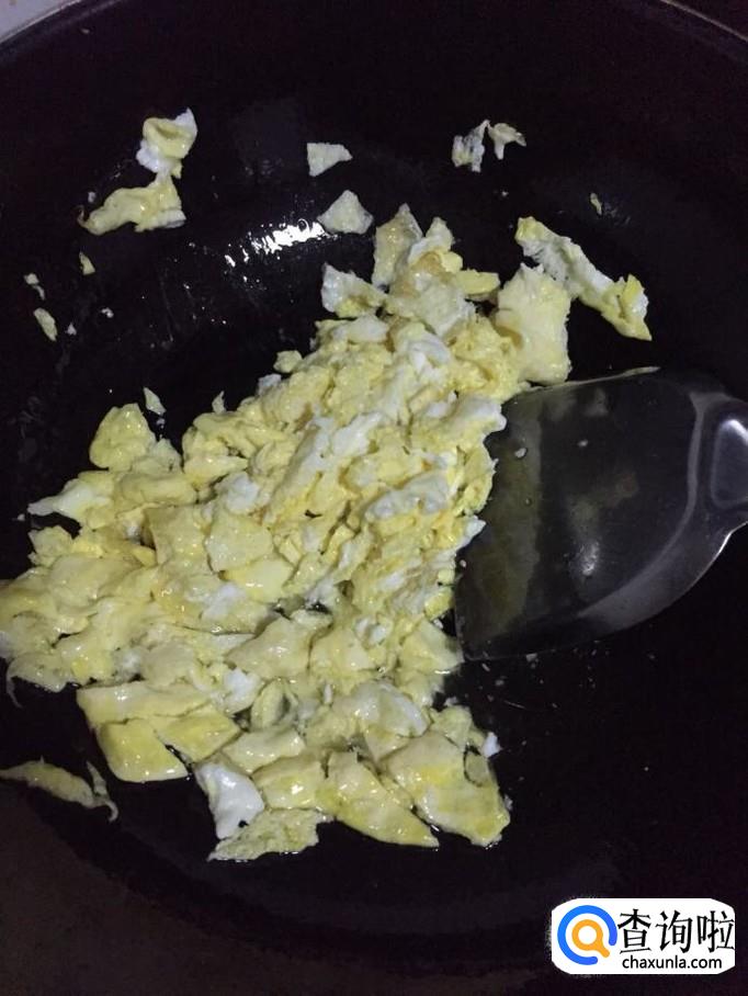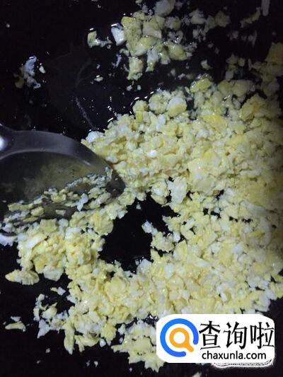 将鸡蛋打散放入碗中,蛋黄和蛋清搅散,锅中加入适量植物油,油热后倒入鸡蛋,像炒鸡蛋一样将鸡蛋炒熟,然后用压碎备用。