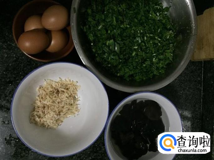 韭菜500克 鸡蛋4个 木耳100克 鲜虾米50克