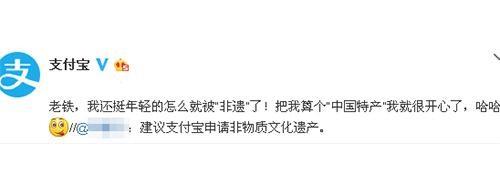 对于大家最常用的支付宝,有网友表示:“支付宝真的应该列为21世纪四大发明之一”、“建议支付宝申请非物质文化遗产。”支付宝官方微博则调侃回应:“老铁,我还挺年轻的怎么就被“非遗”了!把我算个“中国特产”我就很开心了,哈哈”。