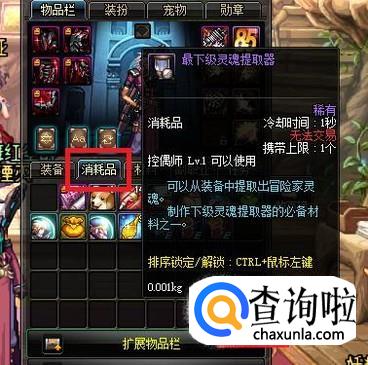 在消耗品一栏中,找到并使用鼠标右键点击包裹中不同等级的灵魂提取器。