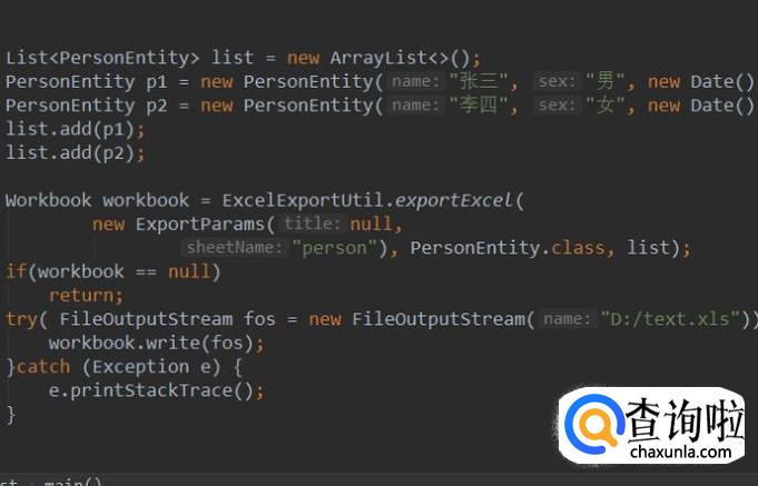 我们写一个测试类去测试导出功能,创建一个测试类,并在main方法中编写测试代码,我们使用easypoi工具类ExcelExportUtil 的exportExcel方法,其中new ExportParams()是标题和sheet的基本设置,当然这些设置有些不是必须的,可以根据需要自行修改。具体的导出代码如下图所示。