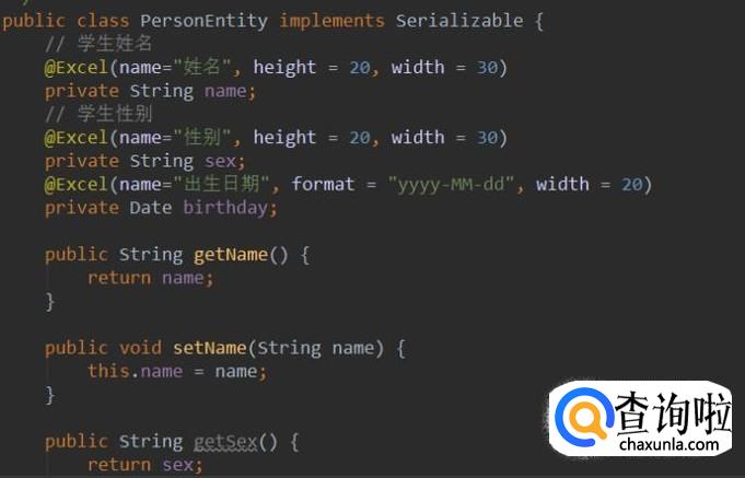 EasyPoi 可以自适应Excel的xls和xlsx两种格式,我们今天主要讲解使用注解进行导入和导出的功能,我们只要修改注解就可以修改Excel的字段和格式。我们需要编写实体和Excel表格的对应关系,在实体上添加注解。@Excel 注解作用到filed(列)上面,是对列的描述。@Excel注解的name属性即为列名,format用于设置时间的格式。我们创建一个PersonEntity,实现序列化接口,并添加如下的注解,另外该类需要getter和setter方法。