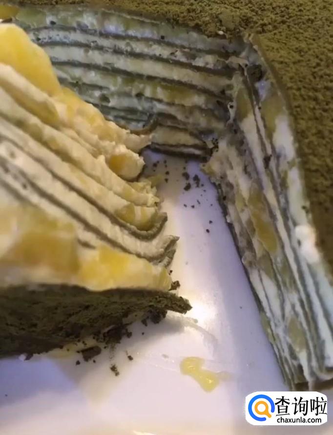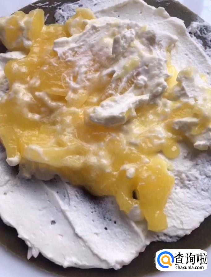 然后我们把两张饼铺在底部,抹上一层淡奶油,再放上黄桃,再铺上一层饼以此类推,全部做好以后在上面撒上一层可可粉,放入冰箱冷藏一个小时