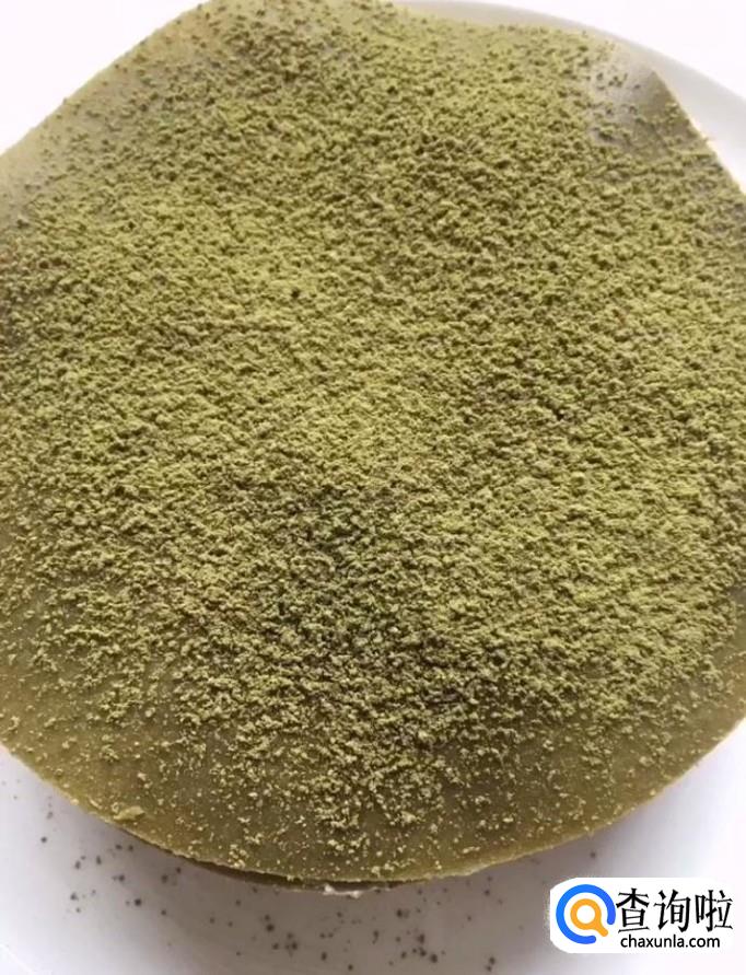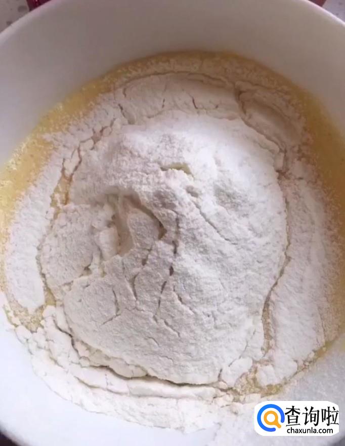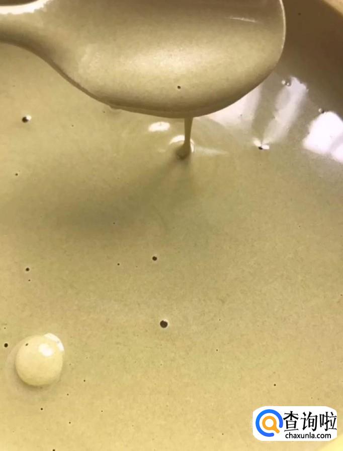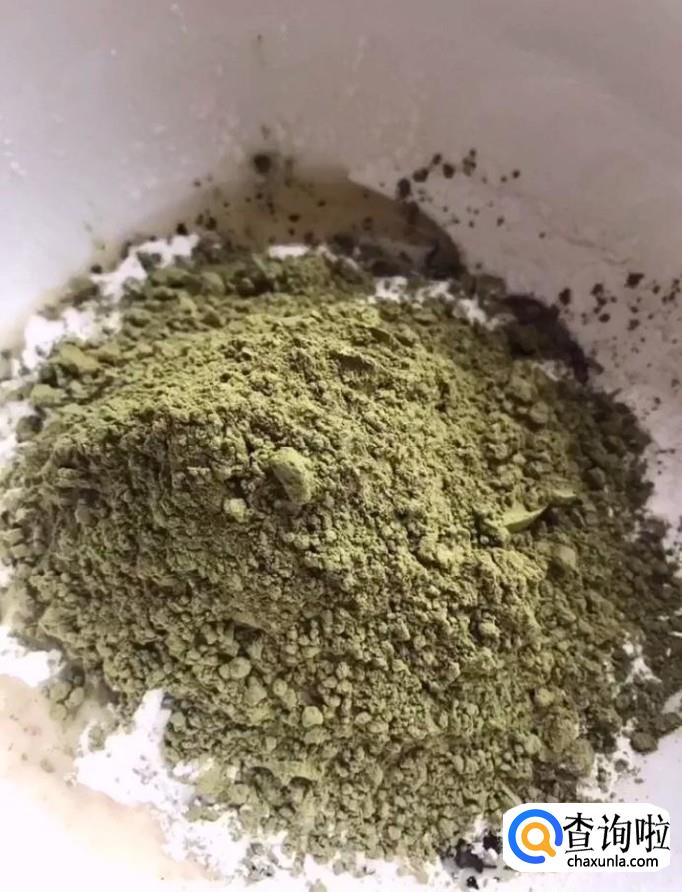 然后我们再筛入70g的低筋面粉,10g的抹茶粉,用勺子搅拌均匀如图所示的样子