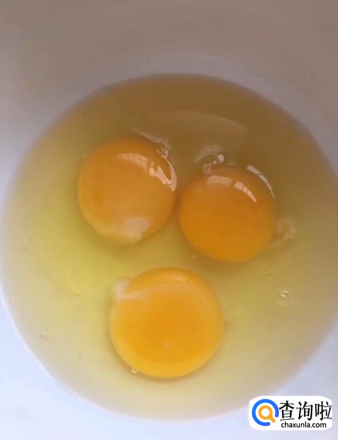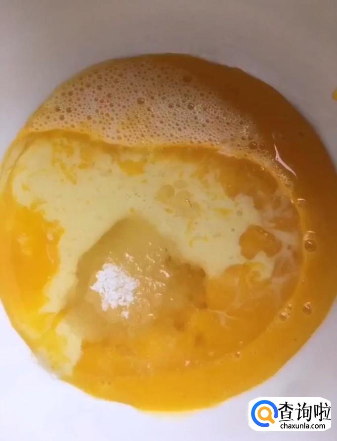 然后我们在一个碗中打入三个鸡蛋,倒入250g牛奶,25g白糖,再把溶化好的黄油倒入其中,搅拌均匀