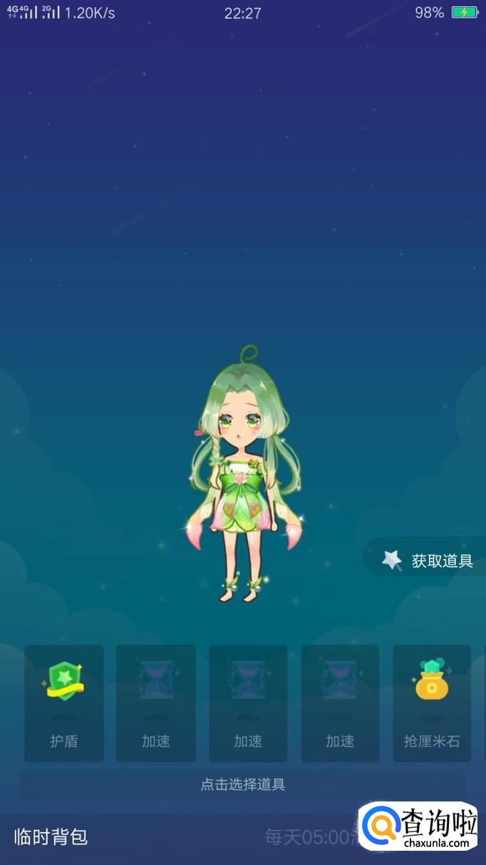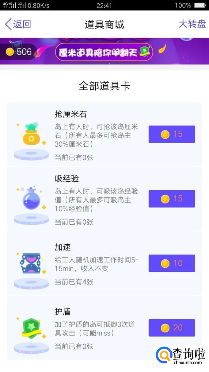 点击“获取道具”之后,就可以看到所有道具的详情了,一共有四个:抢厘米石、吸经验、加速和护盾。