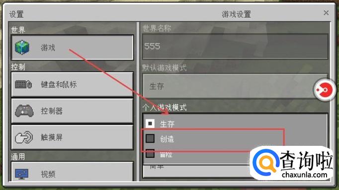 我们点击“设置”,并将“个人游戏模式”中的模式改为“创造”模式。