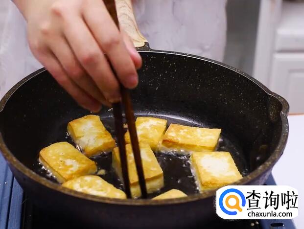 锅中倒油,油热后小火将豆腐煎至两面金黄。