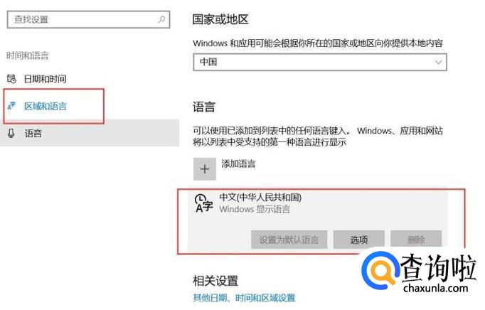 接下来,点击左侧“区域和语言”选项,在输入法程序中,点击“选项”进入设置页面。