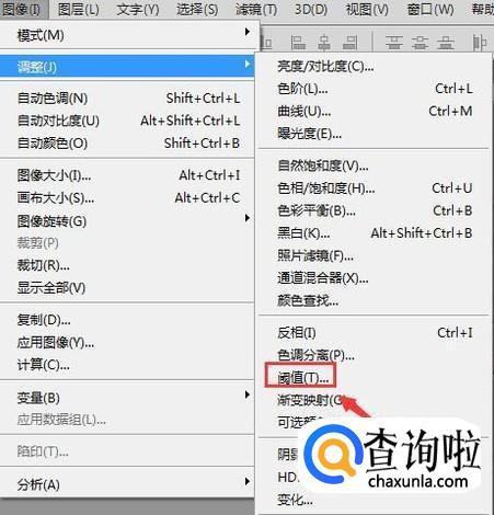 设置好参数之后再在图像菜单里找到调整选项,点击该选项在其内找到阈值选项,如图所示: