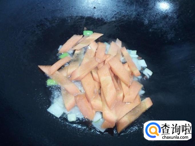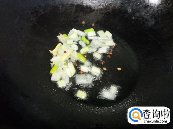 锅里放入油加热,油热后放入花椒,葱,姜,爆锅。放入胡萝卜片翻炒。