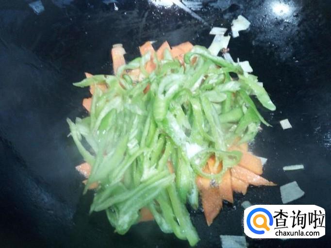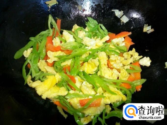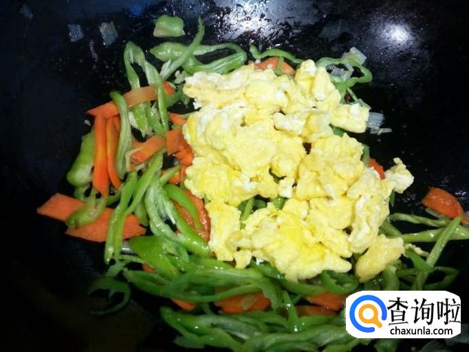 炒至胡萝卜片变软,放入青尖椒翻炒,放入盐。青尖椒稍翻炒一下,放入炒好的鸡蛋。