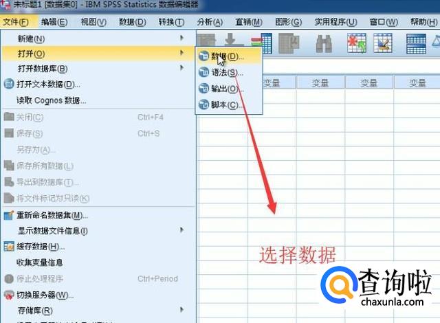 首先点击SPSS软件的顶部文件菜单,选择下拉菜单中的数据选项,如下图所示