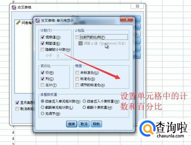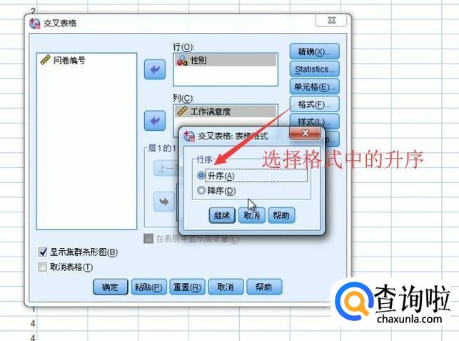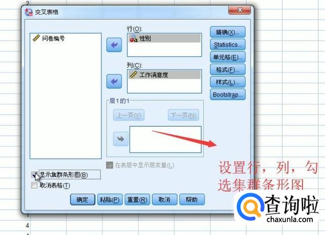 然后在弹出的交叉表格界面中设置行和列的内容,勾选集群条形图复选框,如下图所示