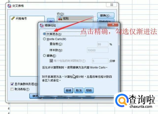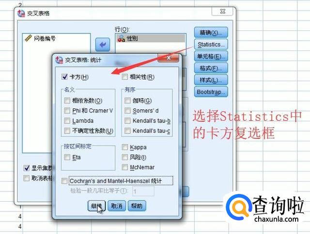 然后点击Statistics按钮,在统计界面选择卡方的复选框,如下图所示