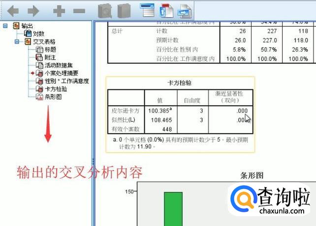 最后确定以后我们就可以看到SPSS主界面已经输出了交叉表分析的所有数据内容了,如下图所示