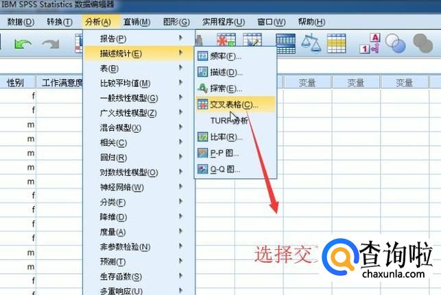 接着点击分析菜单,在下拉菜单中选择交叉表格选项,如下图所示