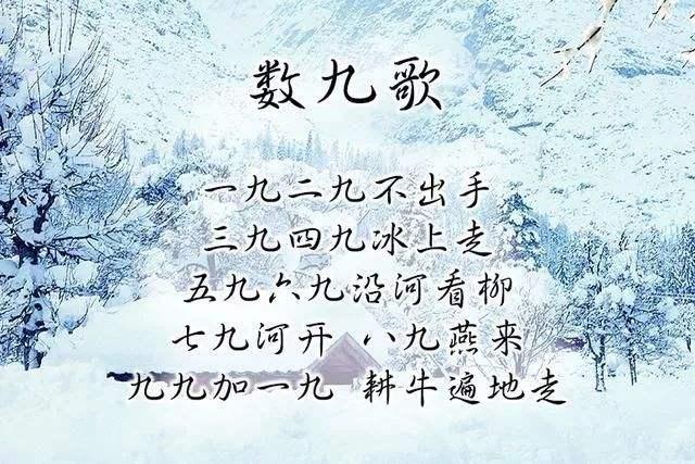 历法在我们中国除了有阴历、阳历外,还有干支历(又叫阴阳历)。每年的二十四节气之冬至开始数九,真正进入数九寒天了。所谓九,就是九天一个九,共九个九,称为:一九、二九、三九、四九、五九、六九、七九、八九、九九。