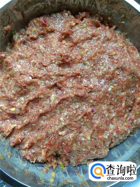 水煎包一般使用牛肉、羊肉和猪肉为馅,今天咱们就用猪肉做水煎包。猪肉剁成馅之后加食用油、生抽、食盐、味素调匀之后,放入葱姜末以及洋葱末,然后用筷子顺着一个方向搅拌均匀。