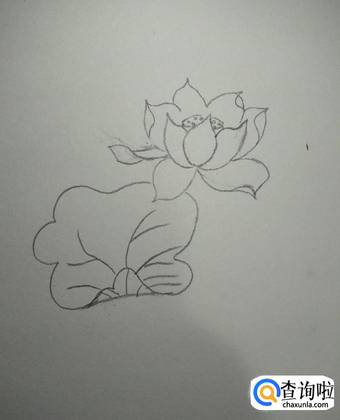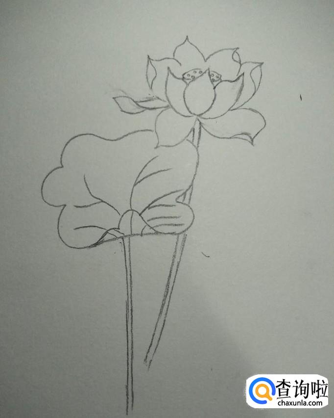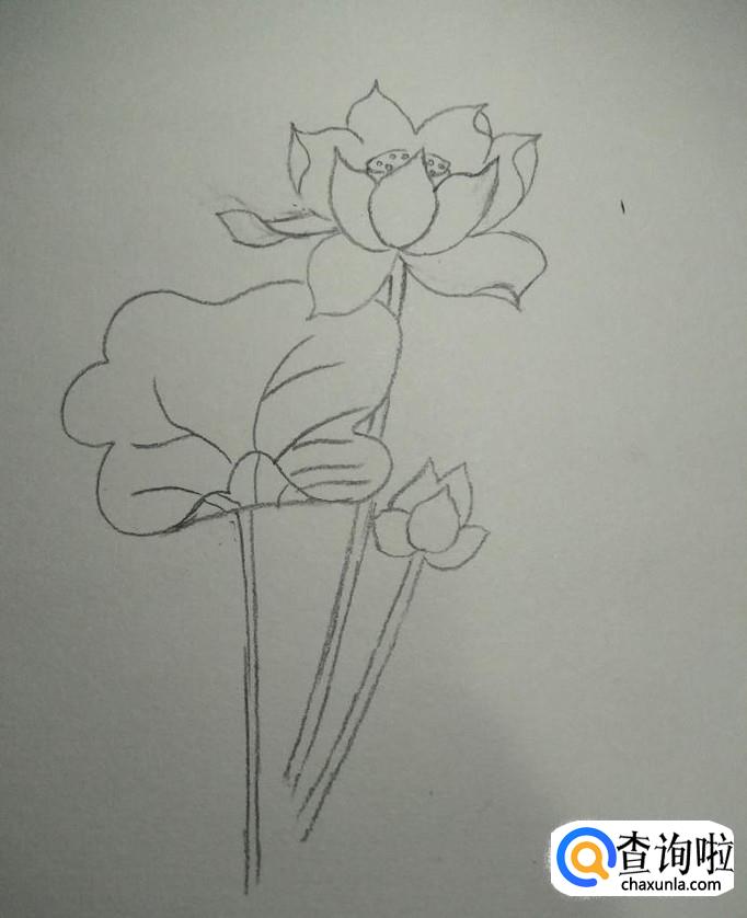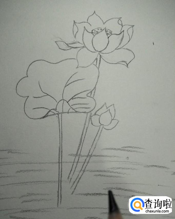 画出河面,直接用笔横着勾勒出水面就好,如下图所示。到此,我们的莲花就画好了。