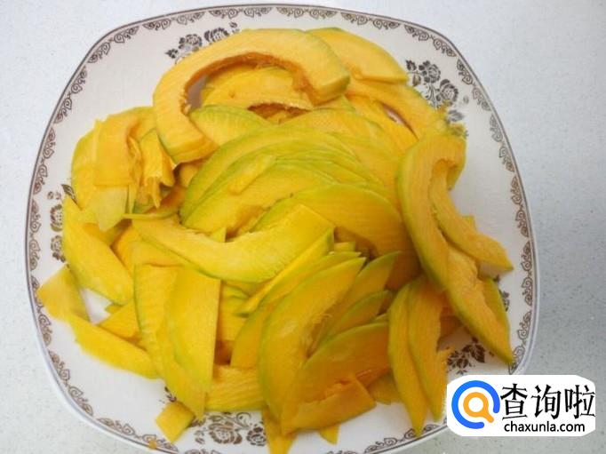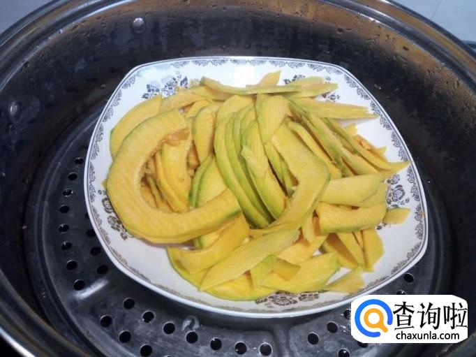 南瓜去皮,去瓜瓤,去瓜子,用水清洗干净,控干水分,切成片(切什么形状都可以,蒸的时候容易熟就可以),然后上锅蒸。