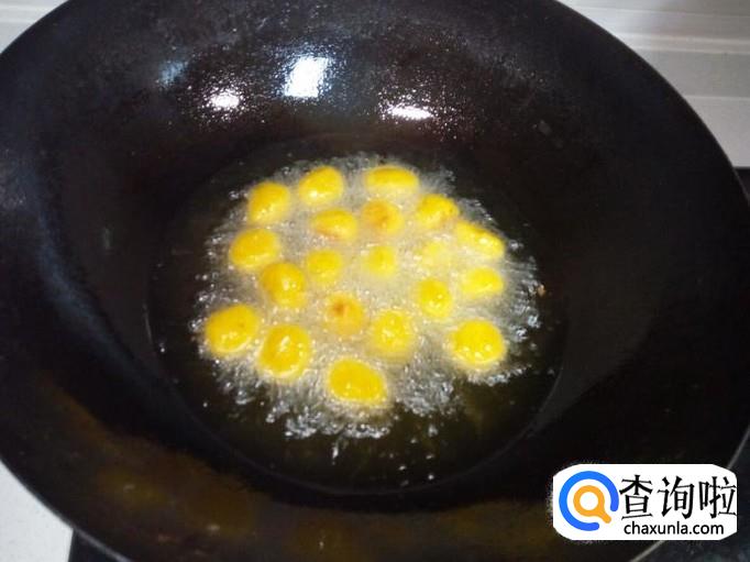 锅内放入稍多一些的油加热,六,七成油温时,把抟成的南瓜丸下入锅中,小火油炸(也可以一边抟成丸,一边下锅炸)。