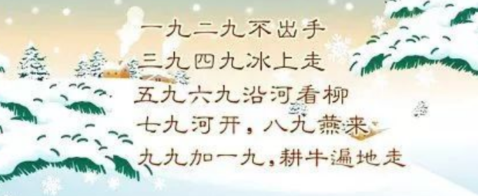 三九天从冬至后的第19天开始算起。计算的方法是从冬天的冬至逢壬日算起(冬至后逢第一个壬日开始叫“交九”,意思是寒冷的开始),每九天为一“九”,第一个九天叫“一九”,第二个九天叫“二九”,第三个九天叫“三九”,依此类推,一直到“九九”,即到第九个九天,数满九九八十一天为止。这时就会“九尽桃花开”、“春深日暖”了。