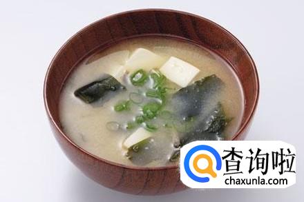 味增汤。味增是一种日本当地的酱料,主要用黄豆制成,做成汤的话非常鲜美。而且黄豆非常有营养,蛋白质非常丰富。