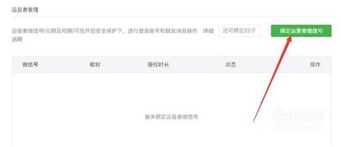 进入管理员信息页面,点击右侧方的“绑定运营者微信号”。长期的运营者可以绑定5个,短期的运营者可以绑定20个。