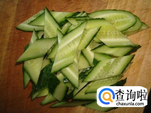 最后,再把切好的小段黄瓜竖着放。在用刀切下去,切成一片一片的,片就成菱形了。