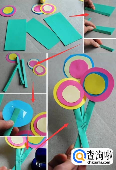 剪出三个长方形的纸片,然后分别把每条纸片折叠成一个细条充当花径。