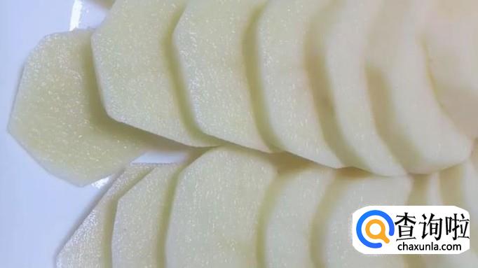 取两个土豆,去皮洗净,将土豆切成1cm左右的薄片。