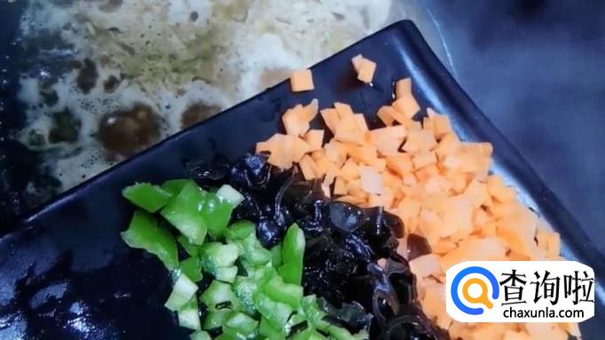 将切好的胡萝卜丁、木耳丁和青椒末倒入锅中,翻炒1分钟。