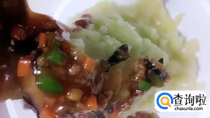 汤汁粘稠后,倒在土豆泥上。肉末土豆泥就完成了!