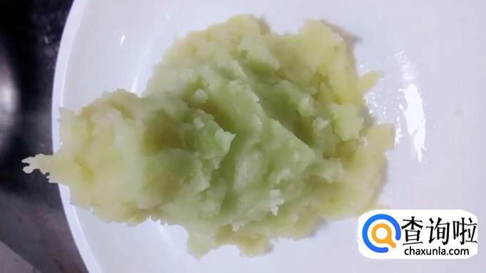 蒸熟后,向土豆片中撒半勺盐,用勺子将土豆片碾成土豆泥。