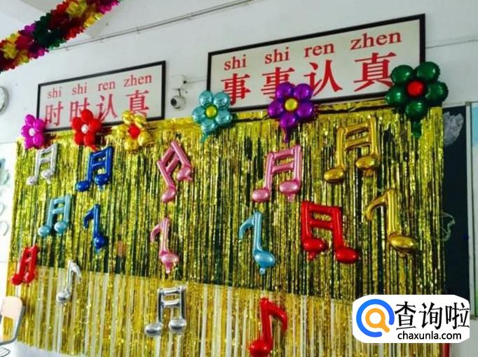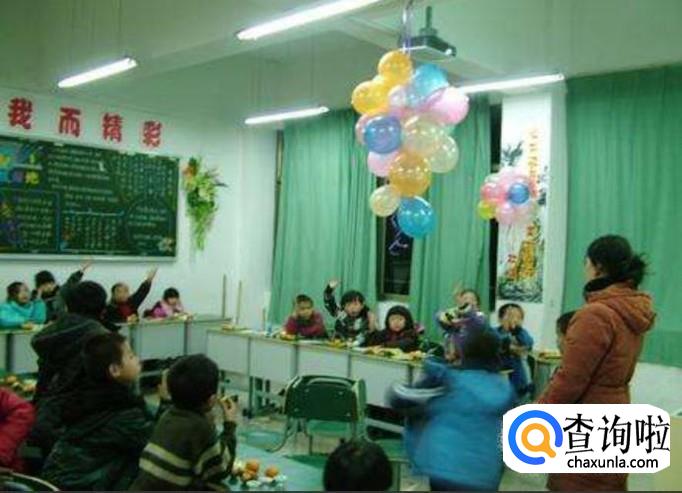 可以使用最简单易得的装饰品,想气球,彩带。将气球绑成一团粘在教室里面,也可以在气球里面充面氢气,这样气球就可以飘在屋顶上面。这时可以将彩带绑在气球尾部,飘起来也是非常好看。